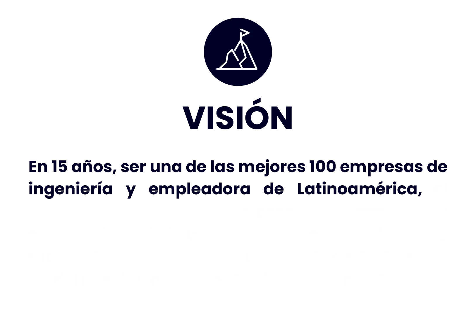 En 15 años, ser una de las mejores 100 empresas de ingeniería y empleadora de Latinoamérica, al brindar de forma segura y consistente, proyectos y servicios de capital humano exitosos e innovadores que superen las expectativas de clientes de cualquier parte del mundo y generen valor de manera constante.