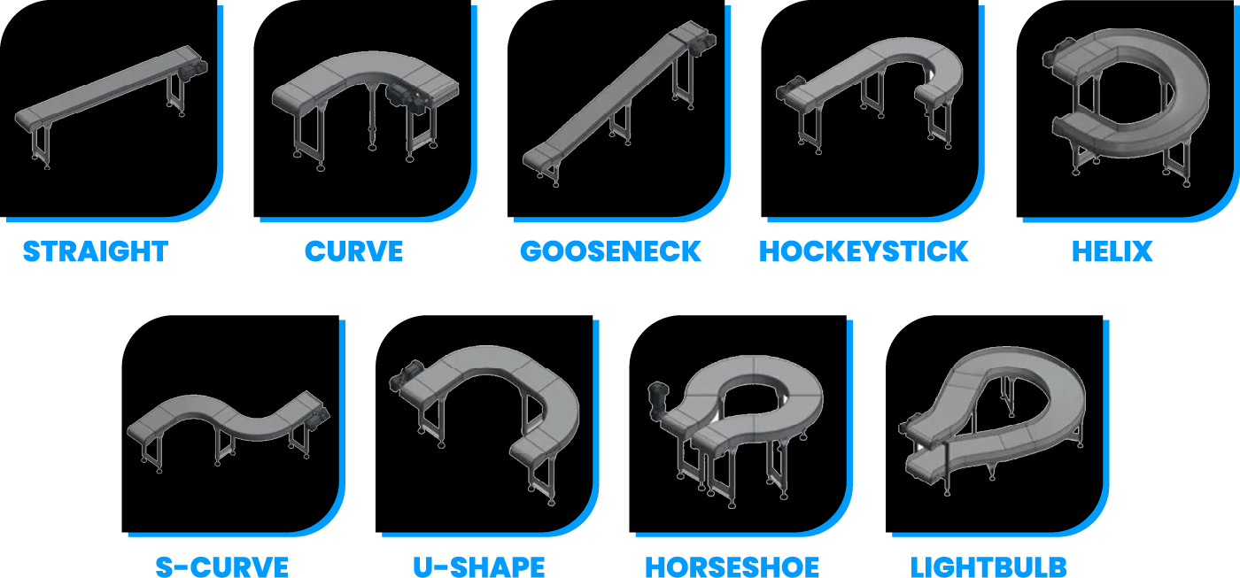 - Una sola transportadora continua incorpora tramos rectos, curvas e inclinaciones.